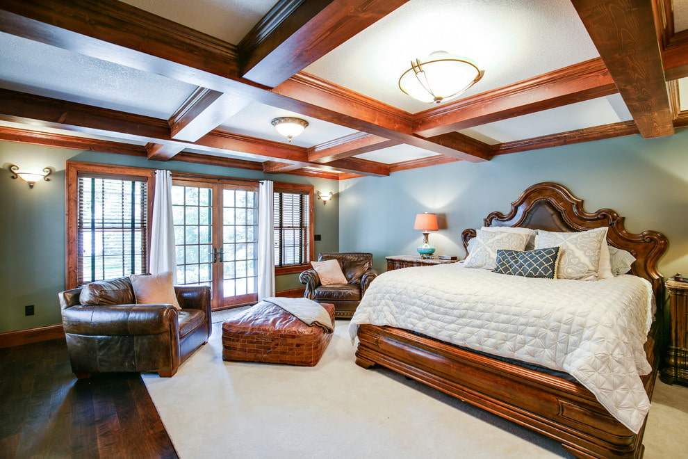 In the photo there is a wooden coffered ceiling in the interior of the bedroom.