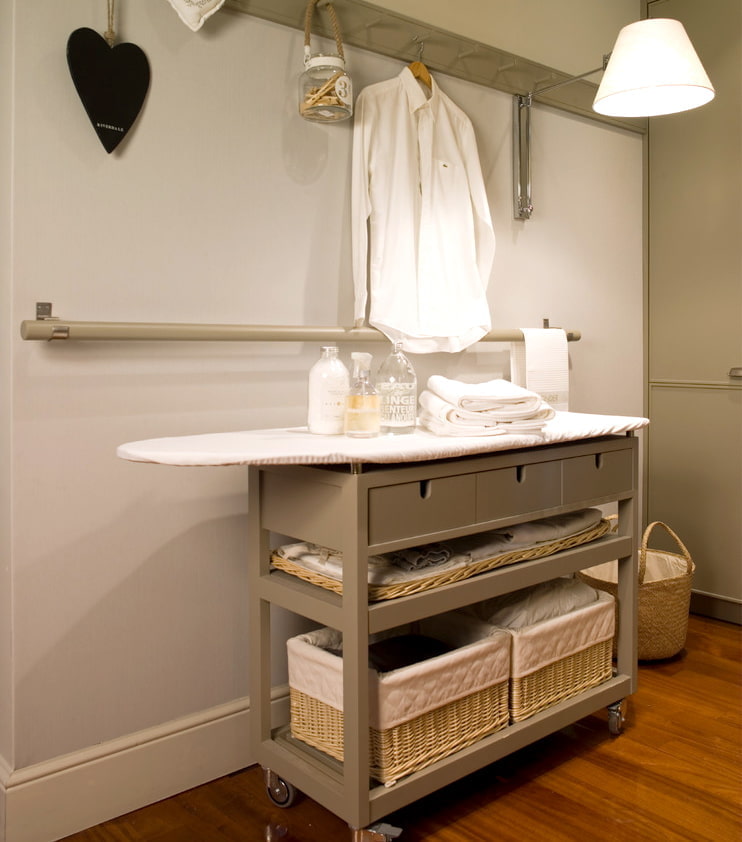 The vertical drawer will help you to use the narrow space to the advantage and successfully disguise the ironing equipment. Another option for a small apartment is to purchase a folding board and hide it in a drawer. The compact ironing device can be built into a dresser or cabinet - so you don't have to worry about finding a place.