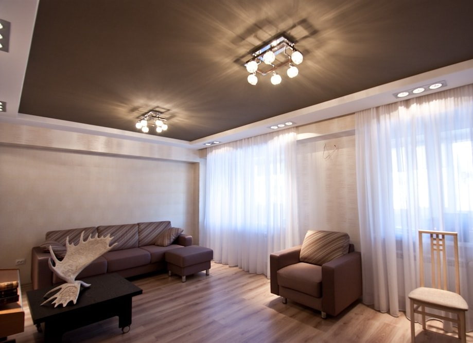 In the photo there is a small living room with a brown glossy stretch ceiling.