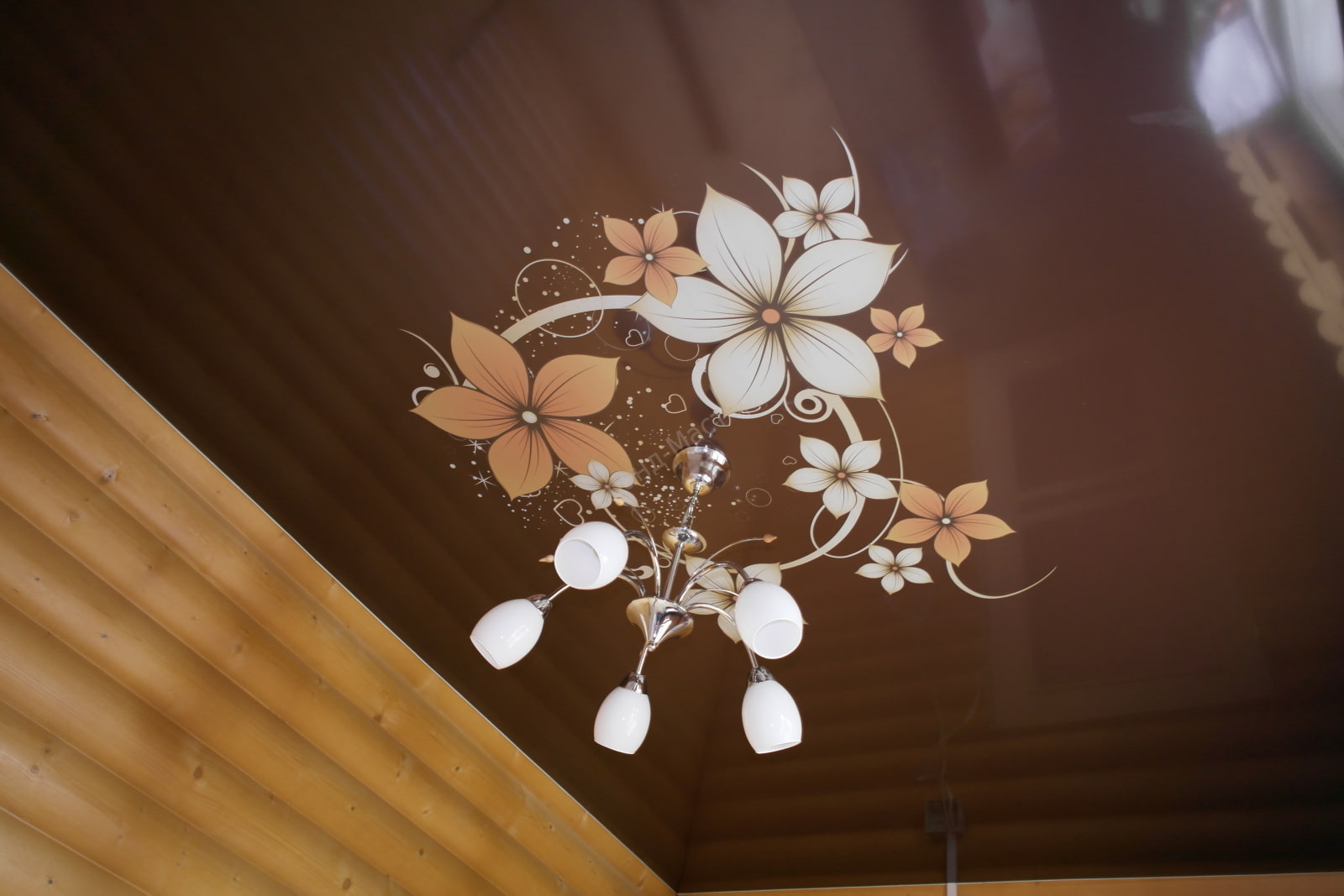 The photo shows a glossy chocolate-colored film on the ceiling in the living room.