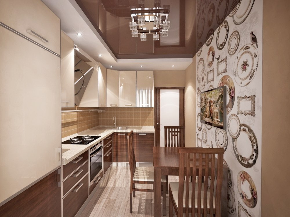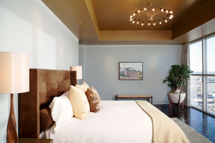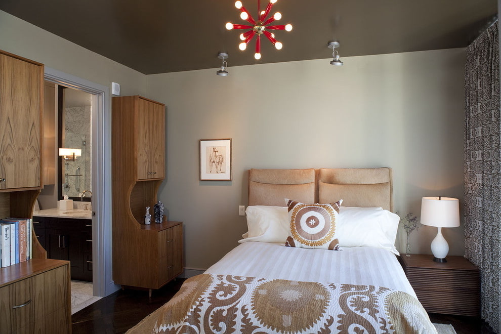 The brown ceiling allows you to effectively emphasize and complement the interior and give it completeness and thoughtfulness. This color scheme will look very harmonious and will not violate the overall design idea.