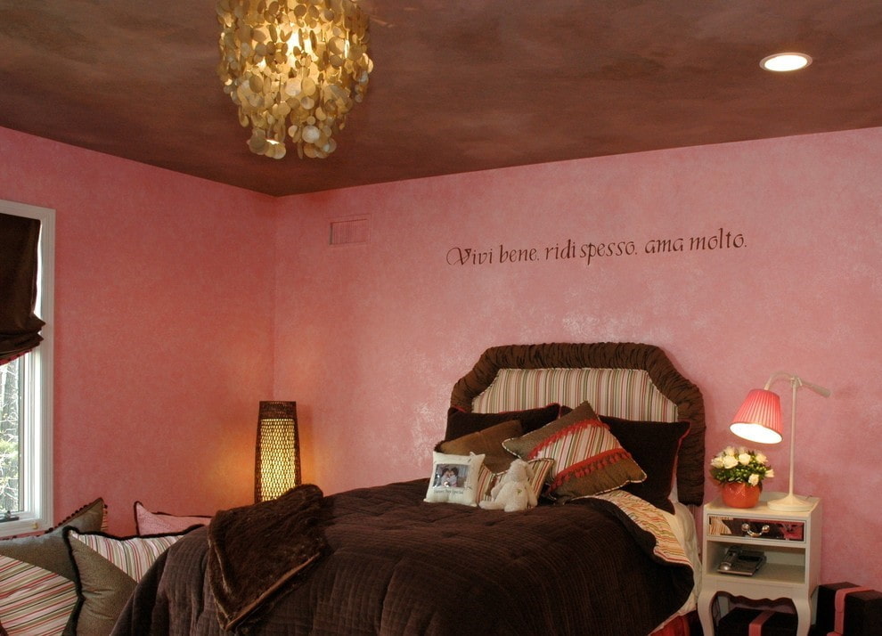 In the photo there is a nursery with a brown ceiling combined with pink walls.