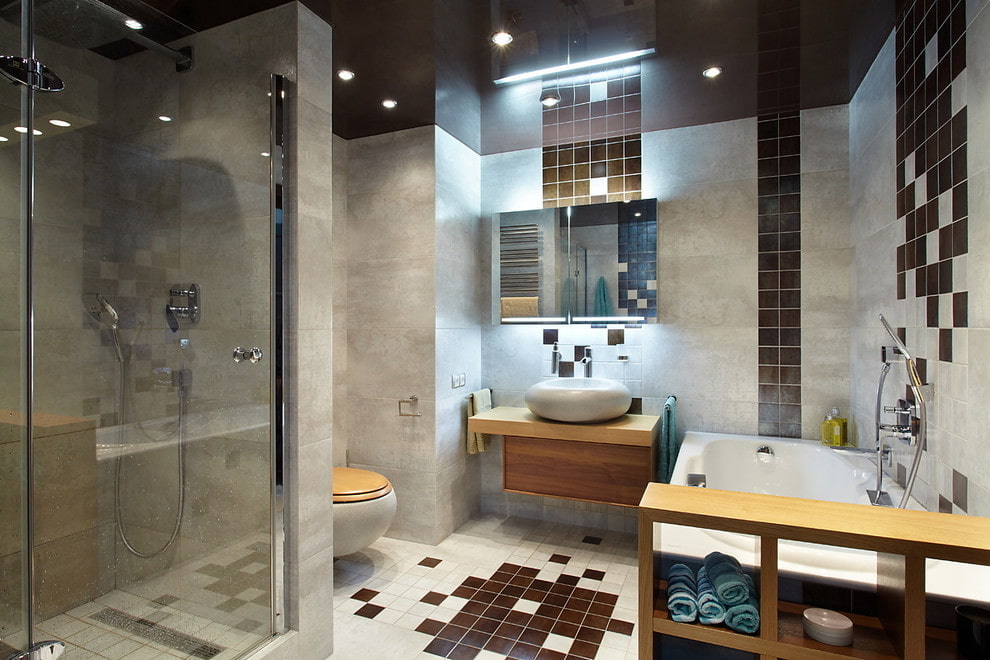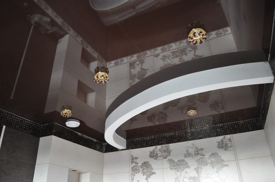 Stretch canvas in brown tones will decorate a bathroom or a bathroom and give them a modern and stylish look. Glossy models look very impressive in combination with shiny white sanitary ware surfaces.