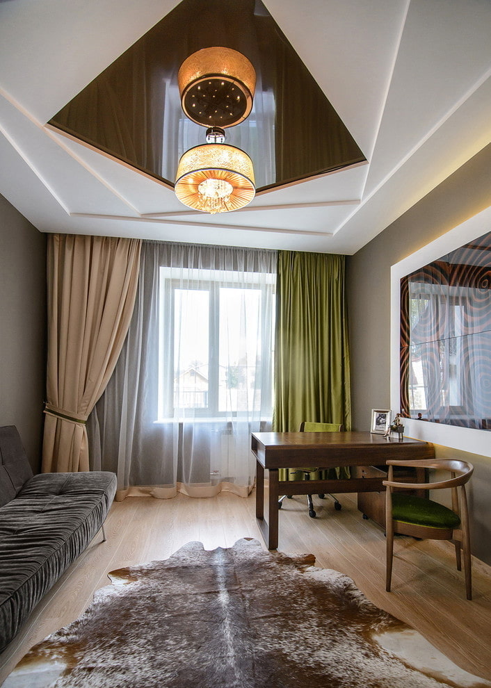 - When choosing a rich ceiling covering, it is desirable that the walls are of a lighter shade and the floor is dark.