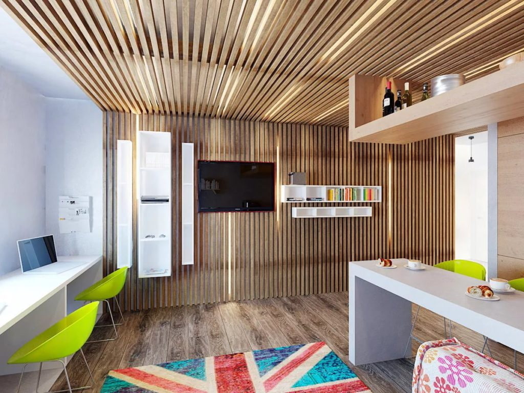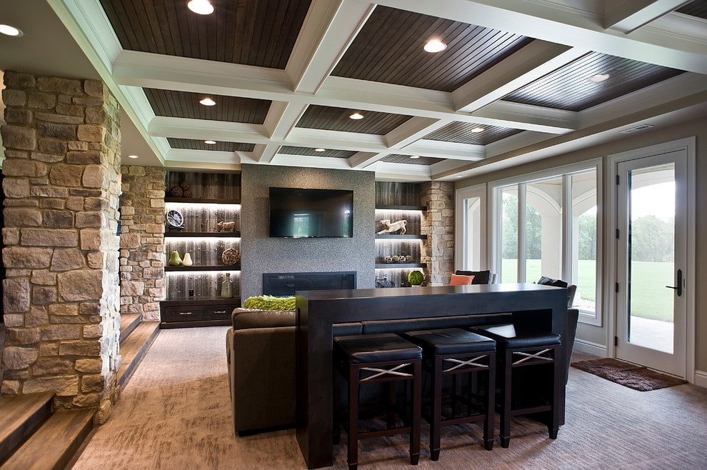 This design element perfectly fulfills not only a decorative function, but also a practical one. The ceiling surface with beams visually expands, zones the space and changes its geometry, and also adds architecture to the interior.