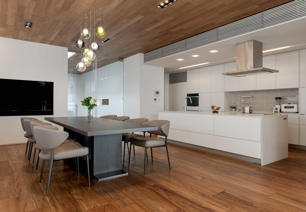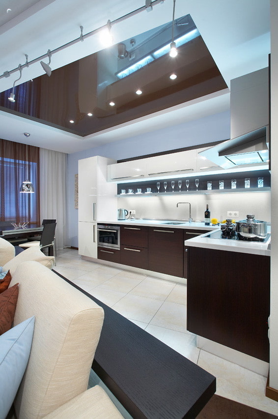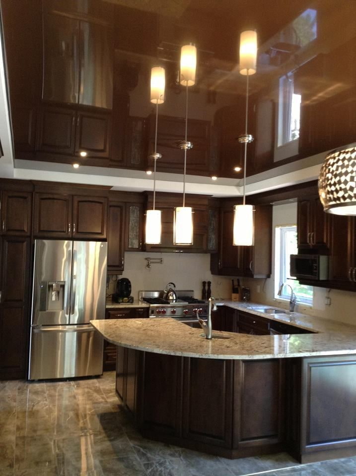 The brown stretch ceiling is a very practical option for the kitchen, as it is very easy to maintain and will always have a very well-groomed and tidy look.