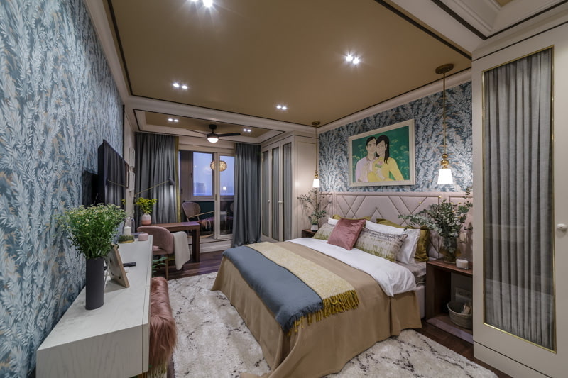 In the photo there is a bedroom with a ceiling covered with brown wallpaper.