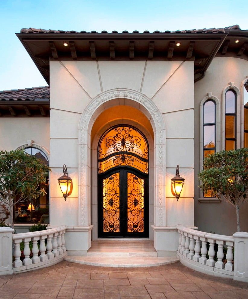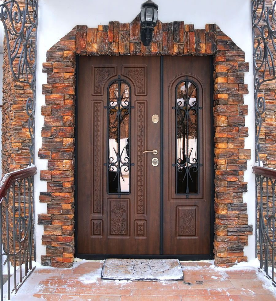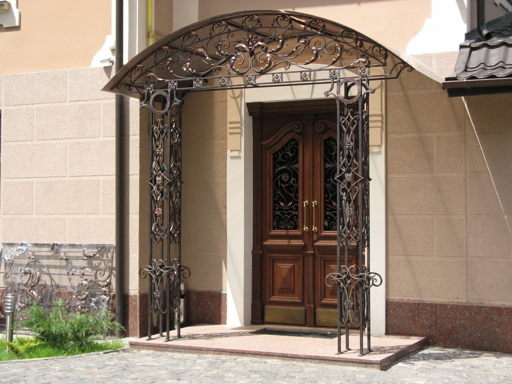 Doors with steel elements are selected depending on the architecture of the facade, the height of the building and the climatic zone. In places with a mild climate, you can install a lighter version with glass inserts; for cold winters, a deaf insulated door with an overhead forged decor is suitable. The porch and the entrance testify to the status of the owners of the house or cottage, their taste and wealth.