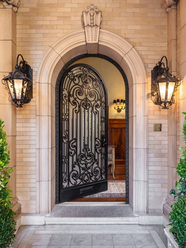 Double-leaf forged doors are suitable for openings from 130 cm wide. Despite the fact that such an entrance structure looks impressive, in combination with a mirror cloth and forged ornament, it gives visual lightness to a stone facade.
