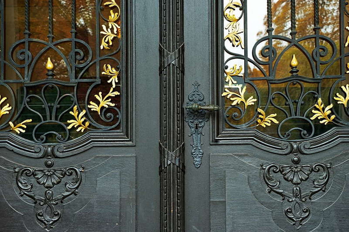 Pictured below is an Art Deco wrought iron door. Longitudinal steel rods continue the lines of the stained glass ornament, the original brass handle is made in the form of a half-hoop.