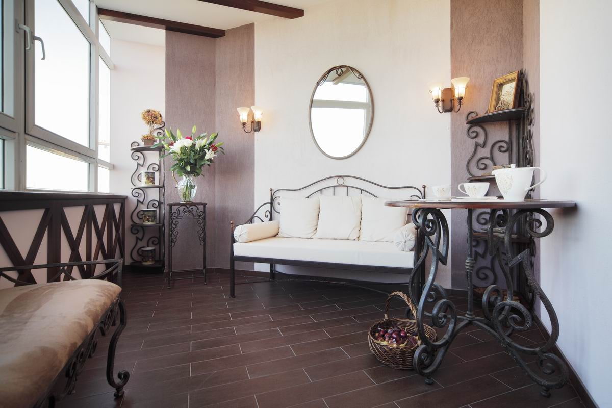 In the photo, a forged coffee table in the interior of a spacious loggia.