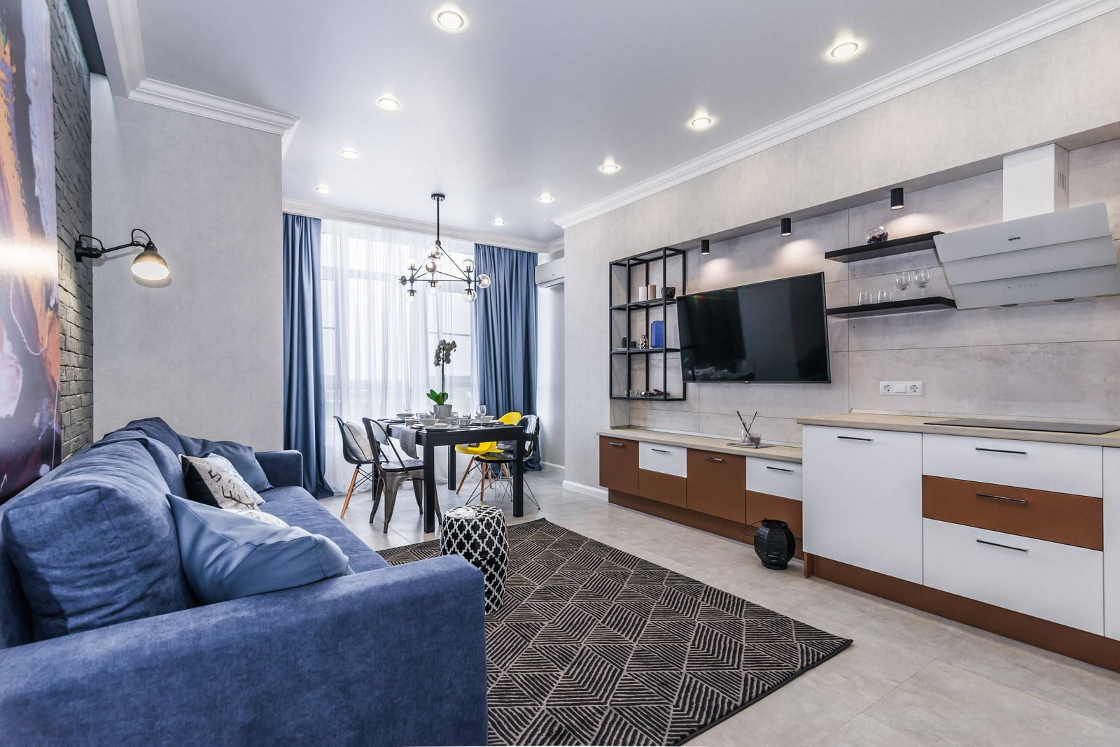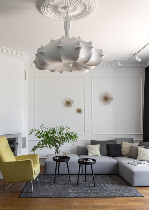 - Round. In order for the carpet on the floor to not look like a black sheep, its shape must be repeated in other details. Round table, smooth outlines of an armchair, an aquarium, a chandelier.
