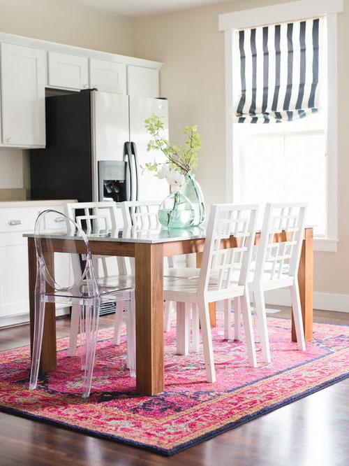 Many people underestimate the importance of paths and rugs in the kitchen, but it is textiles that can add home comfort to this room. It is especially important to lay the flooring along the working area on a cold tiled floor, so you can cook even barefoot. If you don't need a long path, throw a round rug near the sink to make the washing process more enjoyable.
