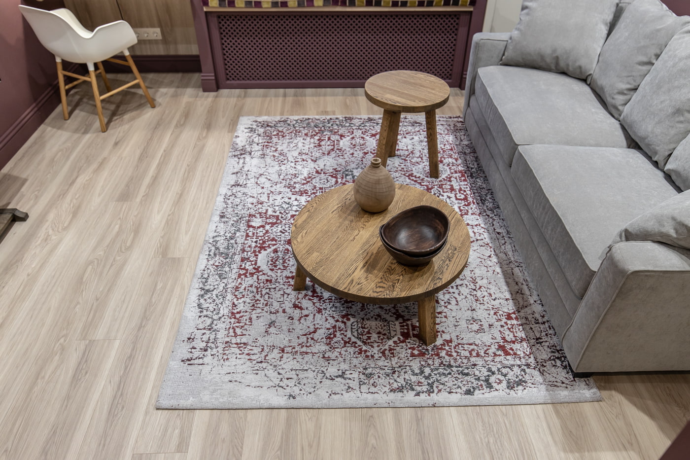 - The smaller the carpet in the interior in relation to the floor, the stronger the contrast between the coverings should be.