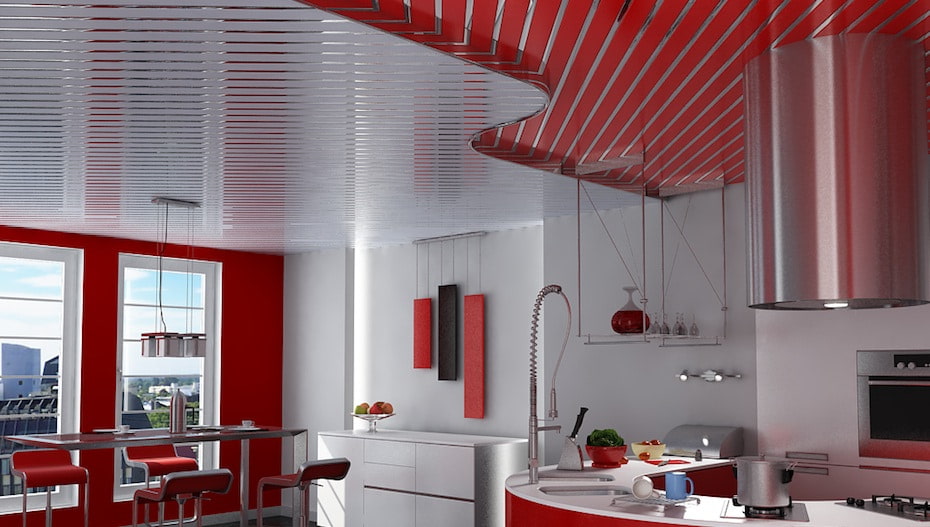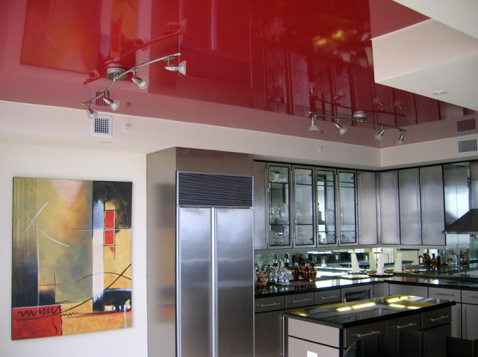 The red ceiling can overlap with other furnishings and finishes. It will be interesting to look at a combination of a bright ceiling and a kitchen set with the same shade of red. To prevent the design of the kitchen from becoming pretentious, it is worth adding a neutral shade to the decoration or furniture.