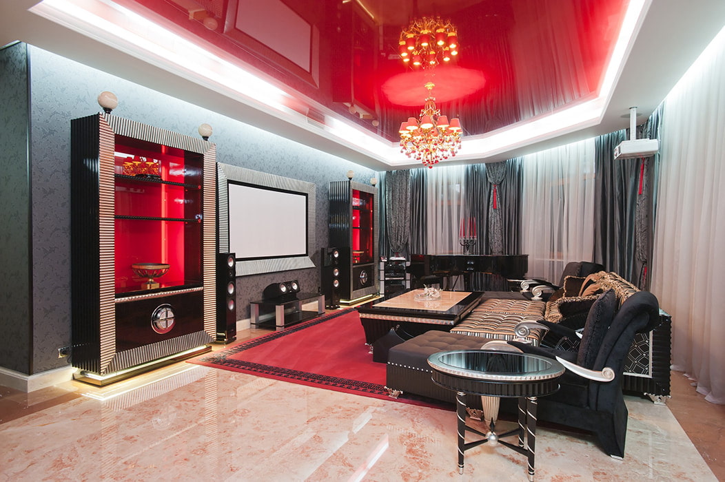 On the picture spacious living room. The two-level ceiling is made of plasterboard with an insert of glossy red canvas.