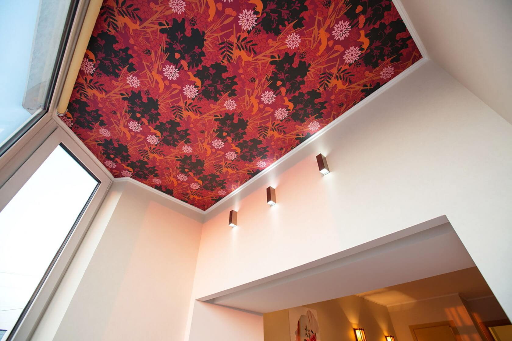 In a company with a red ceiling, light wall decoration will look good, wallpaper of a neutral shade will compensate for the bright red color. A dark palette can make a room look dark and overwhelming.