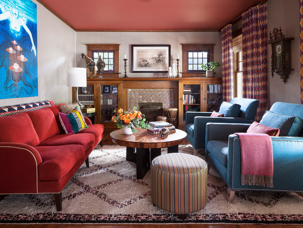 On the picture room in a bohemian style. The ceiling is finished in red with beams, stucco moldings and curly sheets.