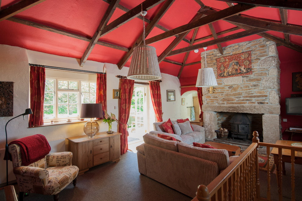 In a rustic country style, the ceiling can be made from wood painted red slats or complemented by natural wood-colored beams.