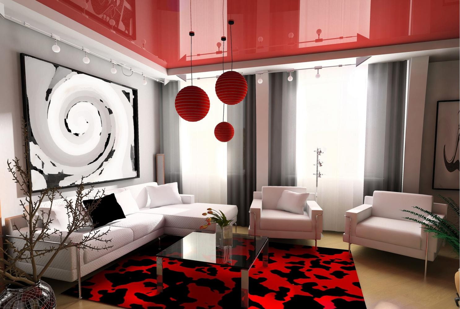 | White | One of the best combinations with red. White walls will compensate for the lack of light and accentuate the ceiling. | |
