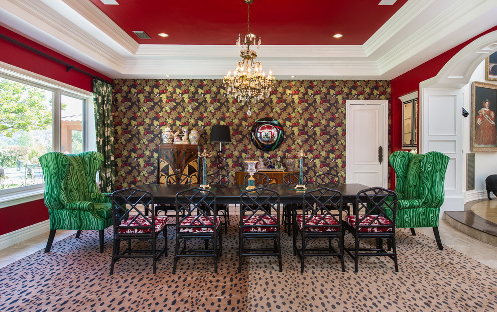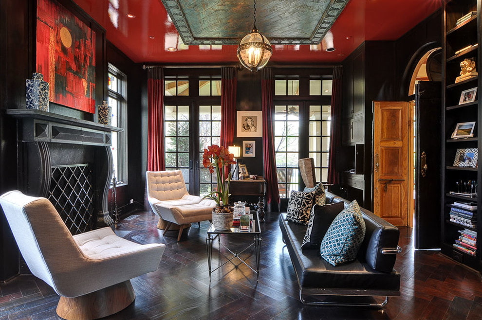 The red color may well be in the form of a pattern or ornament on a light surface. In this case, the ceiling will attract attention and the room will remain bright. Patterns will help to emphasize the thematic direction of the interior.