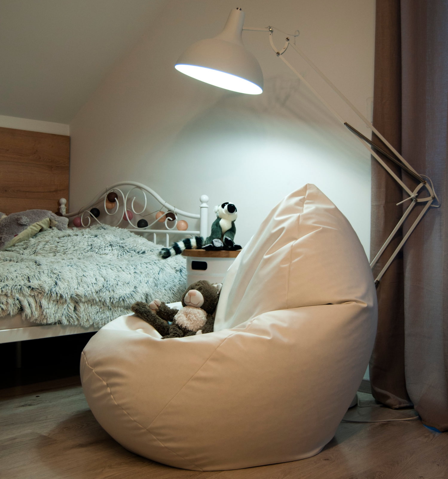 Achieving complete relaxation in the bedroom is possible not only on bed... For a day's rest, place a beanbag chair next to it, and next to it place a small table where it is convenient to put a book or put a cup of tea.
