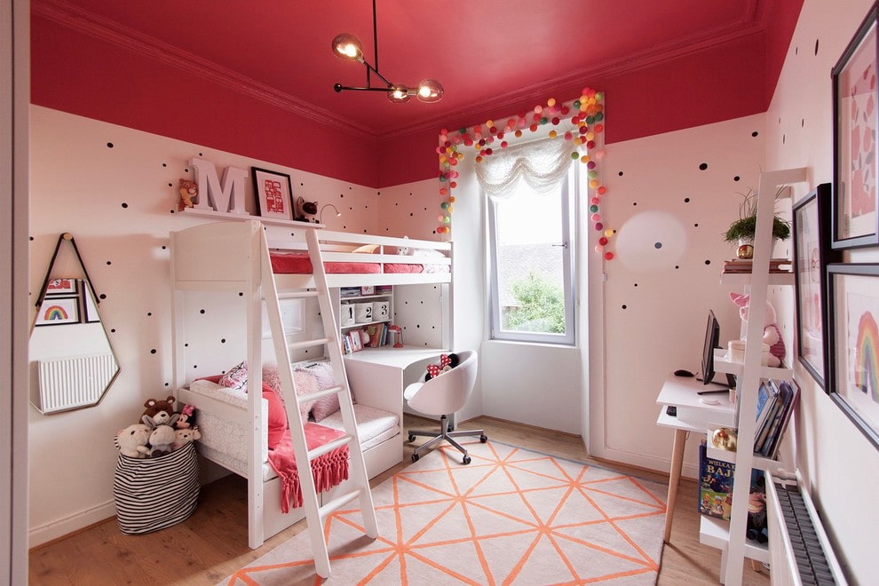 Most often, the lower zone is equipped with a work table. You can use a traditional writing desk with a curbstone, a light roll-out table, a dressing table with a mirror. A pull-out table, if necessary, frees up space under the attic for playing or cleaning. The photo below is an example of a desktop for a student with bright red details and an office for an adult made of natural wood. The attic in both cases is fenced with a railing 40 centimeters high.