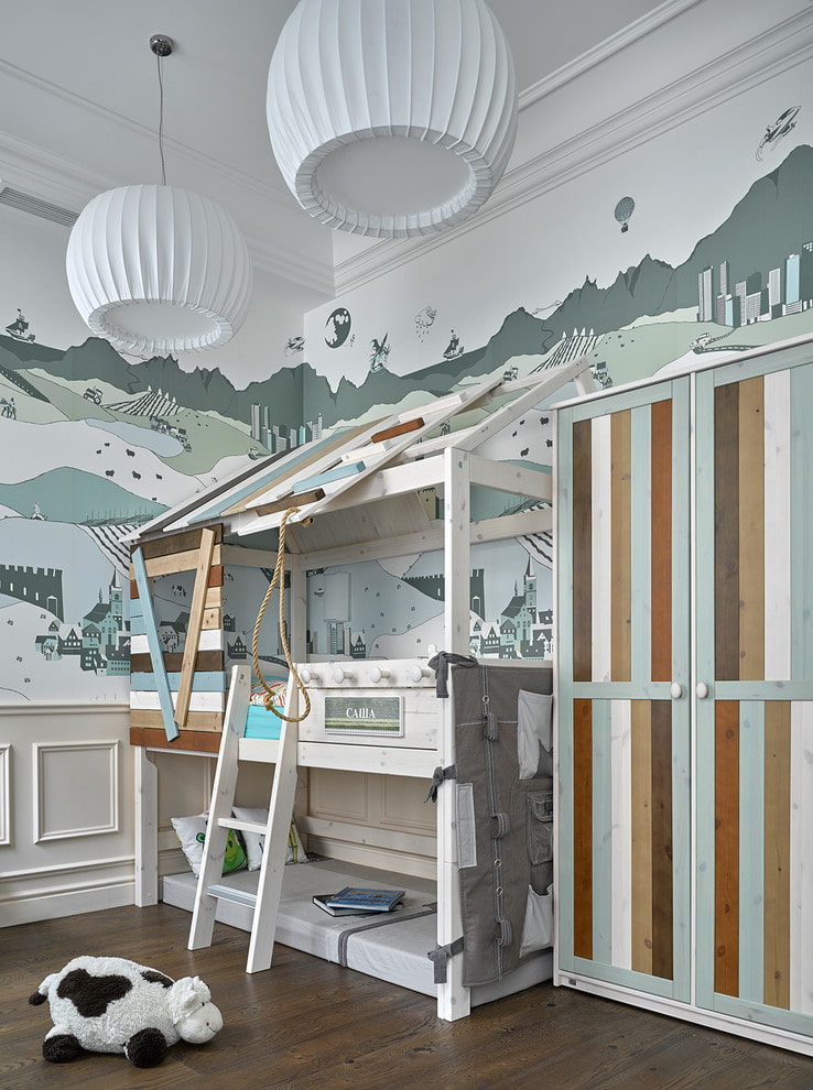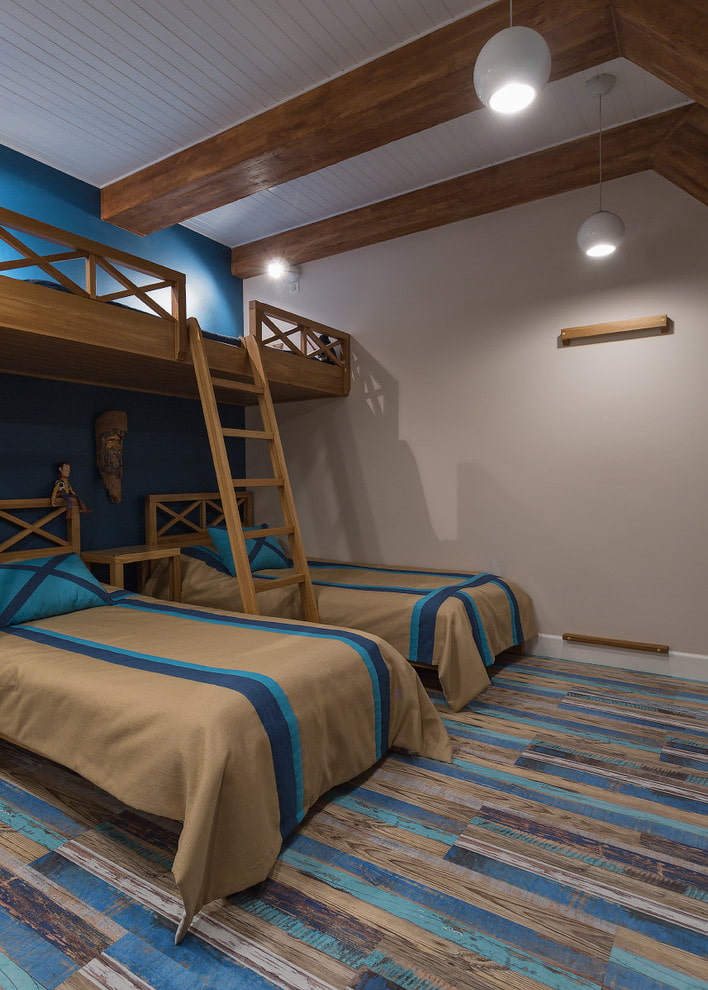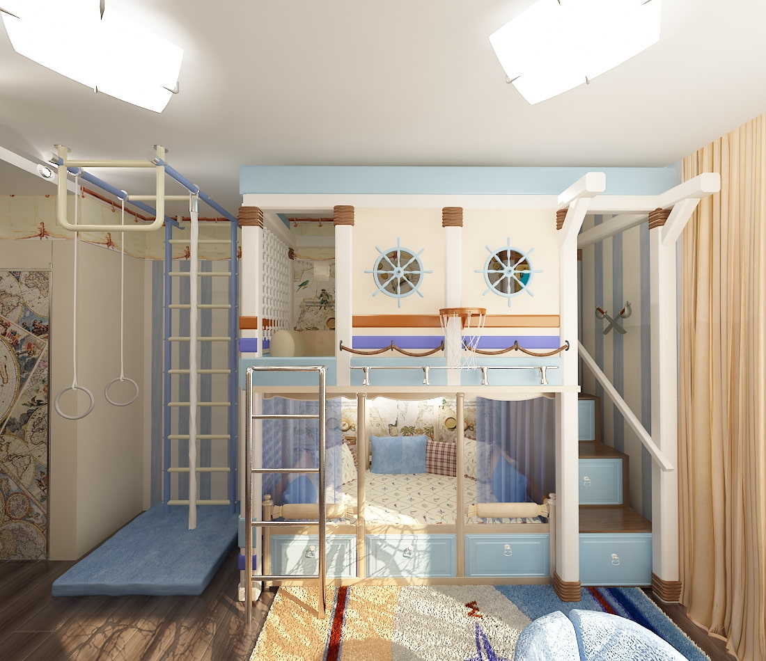 The nautical style borrowed decorative techniques from the interiors of the cabins and ship equipment. Basic colors for this style are white, blue. To design bunk beds, designers use round openings in the form of portholes, rope railings and climbing ladders.