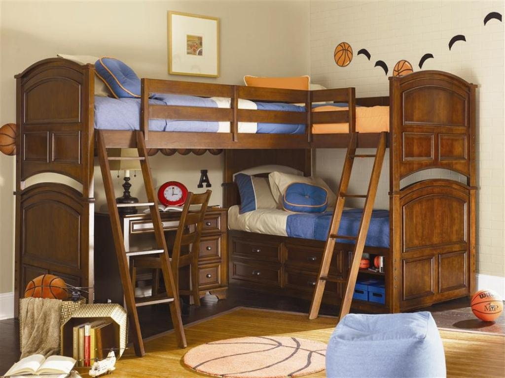 Corner furniture allows you to use every square meter of the room. For stability, the corner loft bed is attached not only to the floor, but also to the wall. Pictured on the left is a bed with a loft in a classic style with two berths, storage boxes and a desk. In the photo on the right, the perpendicular arrangement of the beds forms a right angle, on the side there is free space for a wardrobe and stairs.