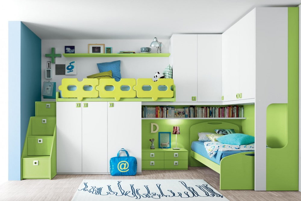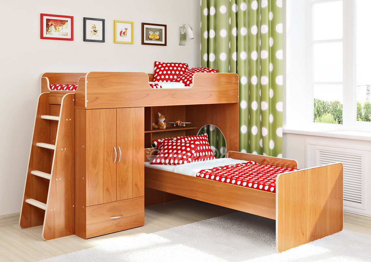 The loft bed is combined with different pieces of furniture: a desk, a second bed, shelves for books and toys, wardrobes or a chest of drawers for clothes, a sports complex.