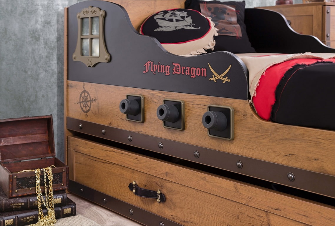 The loft bed resembles a two-deck boat. To make the loft bed look like a sailboat, the designers use natural wood, steering wheels, pirate paraphernalia.