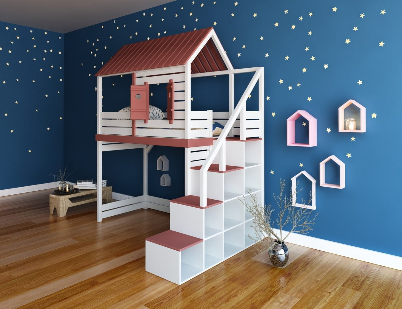 The loft in the form of a house is suitable for quiet games and reading before bed.
