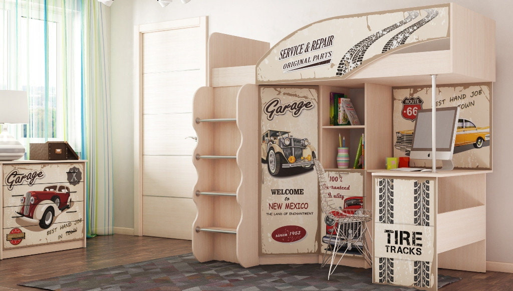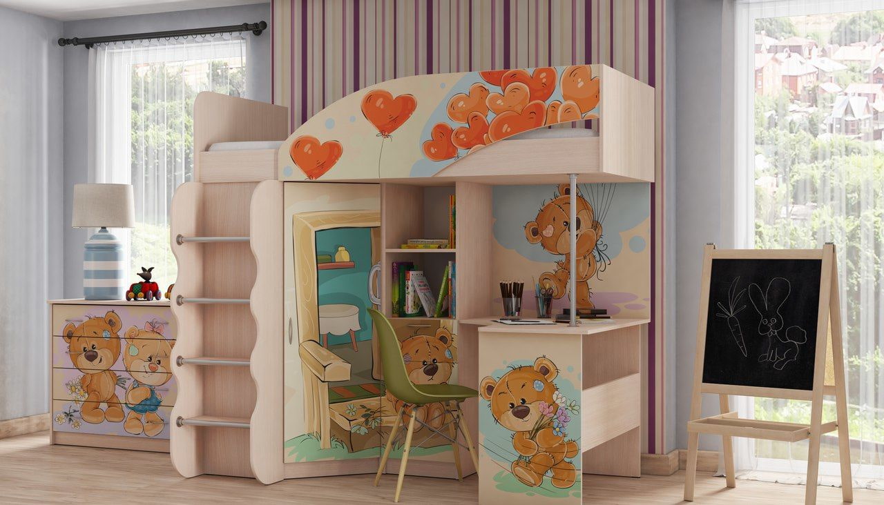 Photo printing of current prints or favorite characters from books and cartoons on a loft bed will give individuality to typical furniture models. Digital printing does not fade in the sun, does not flake and is harmless to children.