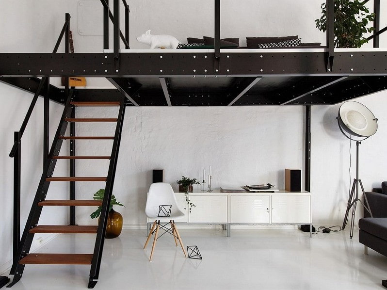 A loft bed solves the problem of choosing: a sofa or a bed? In studios, the living room serves as a kitchen, dining room and living room, so it is logical to raise the bed up and not draw the attention of guests to it. The sofa can be supplied with a loft bed, or they leave free space for it under the sleeping bed.
