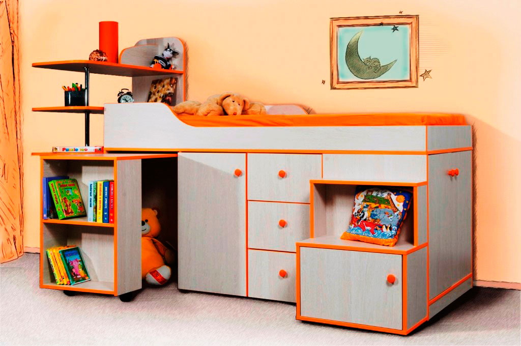 Play is a child's way of learning about the adult world. It is important for children to have a space where they not only play, but also learn to maintain order. The loft bed allows parents to organize a play area even in a small apartment. The bed is combined with a slide, shelves for toys, mats for outdoor games.