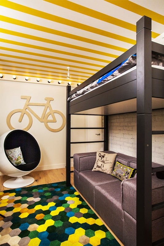 A high loft bed can be placed under the very ceiling like a mezzanine; designers offer such sleeping places for youth interiors.