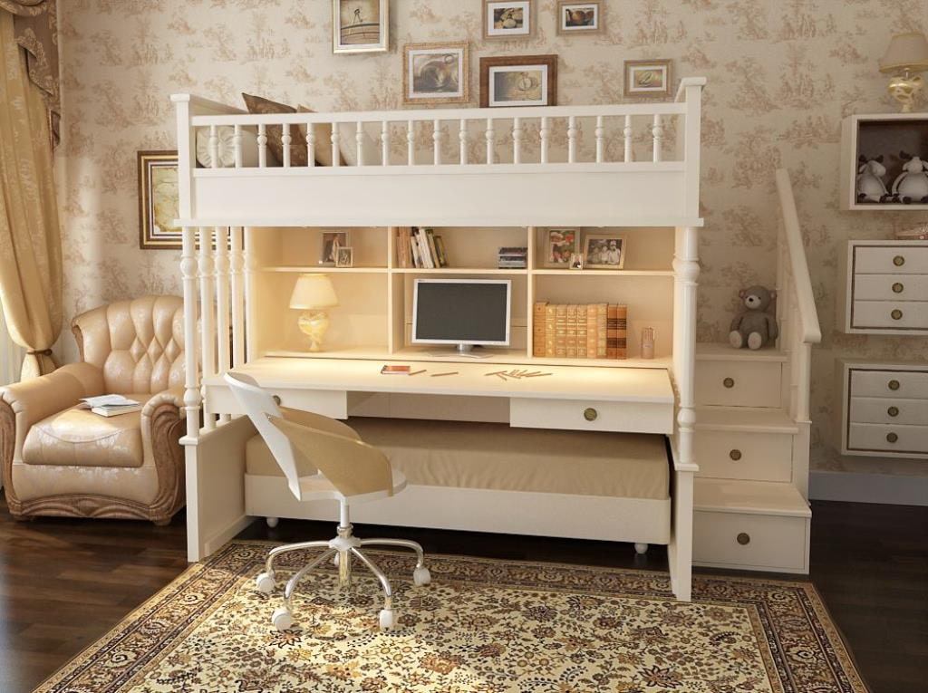 On the picture a white loft bed in a classic style, an extra bed on wheels is installed under the table top on the lower level.