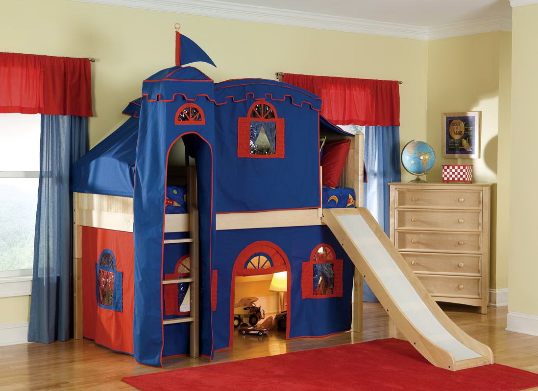 On the picture loft bed with an awning in the form of a fairytale castle. If necessary, the awning can be removed for washing or repairing.