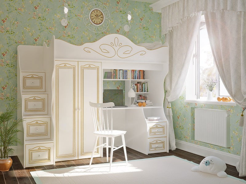 Provence is a homely style with vintage notes. The Provence style loft bed is made of natural wood in light colors with antique processing. Bed linen, canopies, curtains with fine colored patterns will support the theme of a country house with a long history.