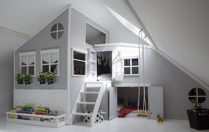 On the picture the children's room is equipped with a low slide and a sleeping module in the attic in the form of a house.