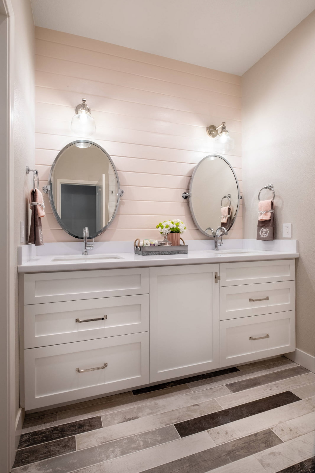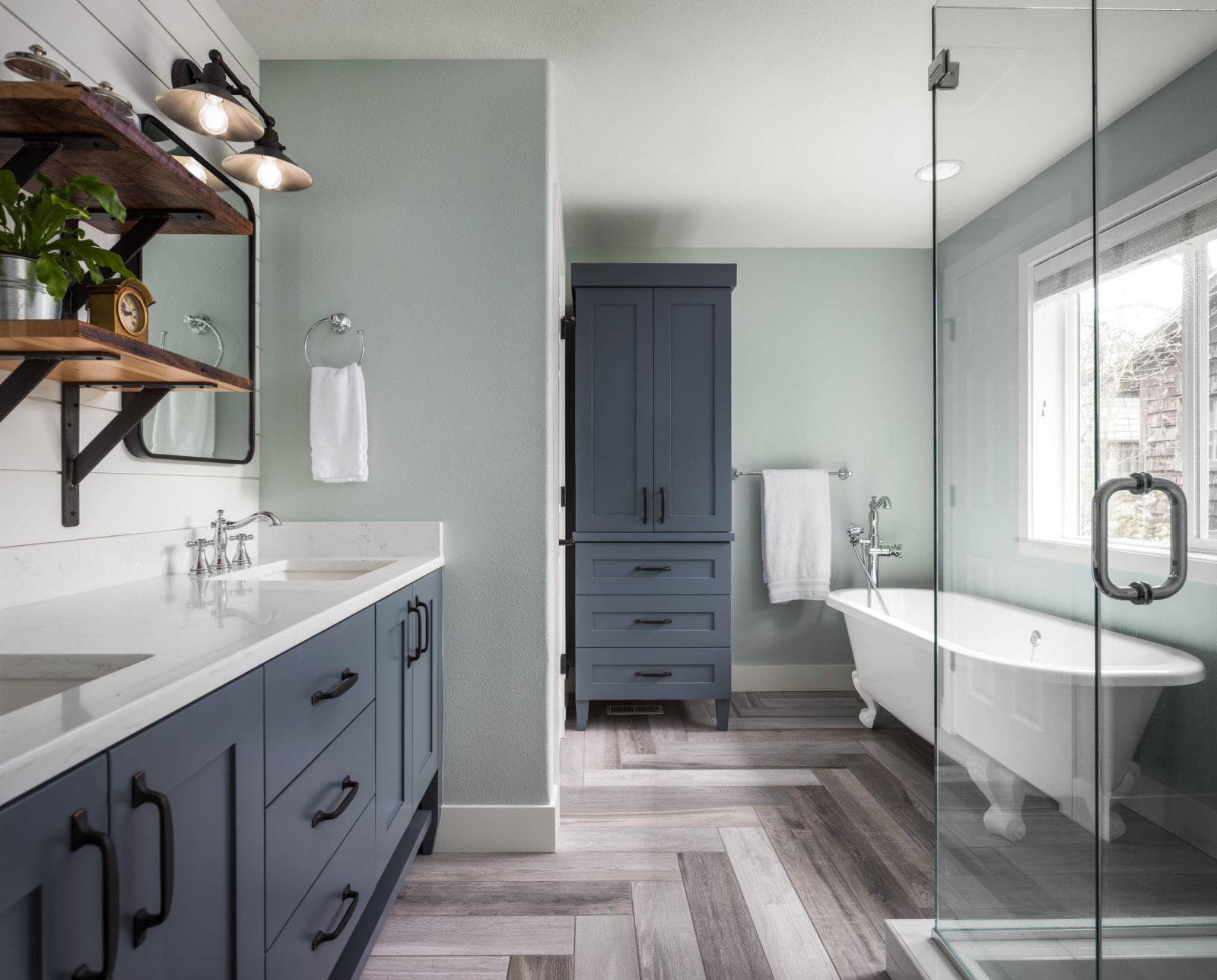 Quartz vinyl, imitating aged boards, looks great in the bathroom interior.