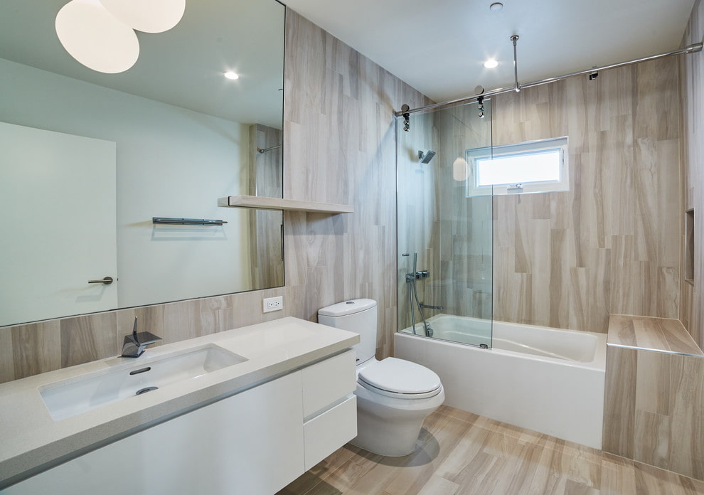 The photo shows a bathroom in which both the floor and walls are finished with quartz-vinyl.