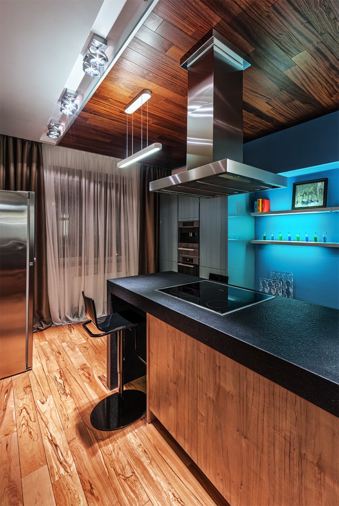 The ceiling in the kitchen should be practical and stylistically match the overall interior of the apartment.