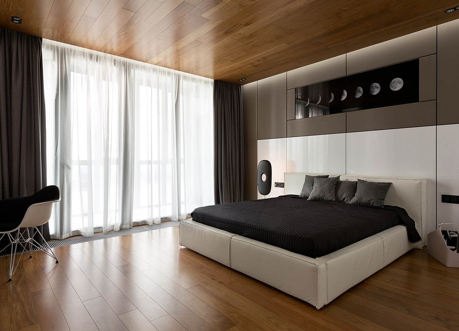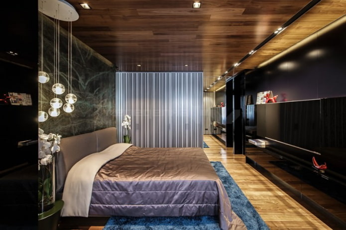To create a chamber atmosphere and coziness in the bedroom, the ceiling can be made of laminate. A combination of materials and multilevel ceilings are often used.