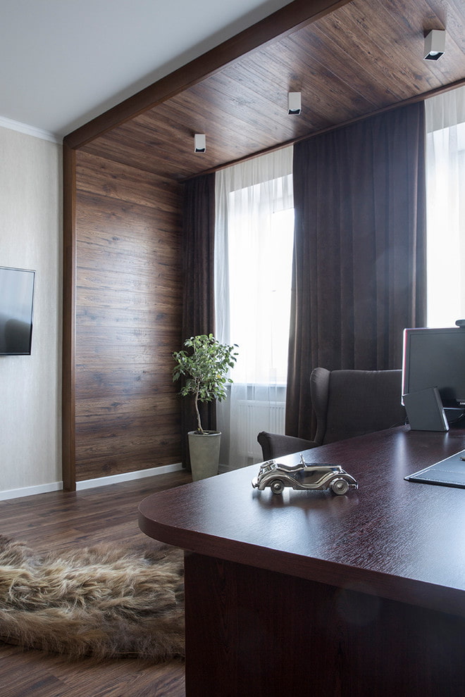 A modern or classic interior will ideally emphasize the ceiling with a pronounced wood grain texture, and a warm shade will fill the house with coziness. It can be either light brown or dark wenge.