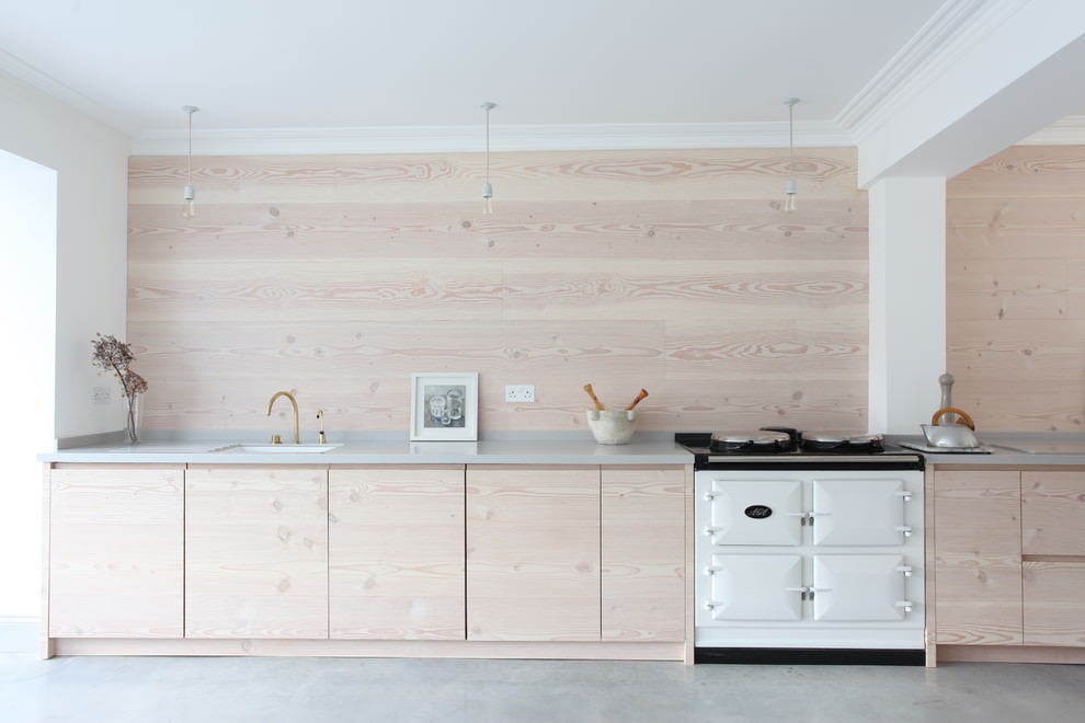 Laminate on the wall in the interior of the kitchen can be used as an accent contrast wall and a work surface apron that will protect against splashes and can be easily cleaned. The color should be in harmony with the facade of the kitchen unit. To highlight the dining area, you can make a laminate wall in the color of dark wood.