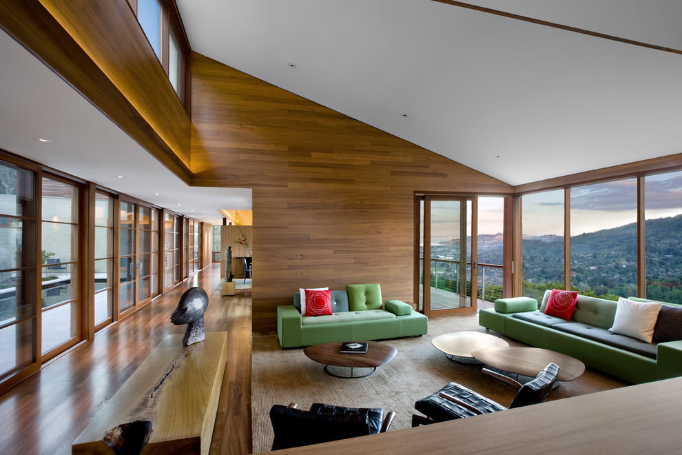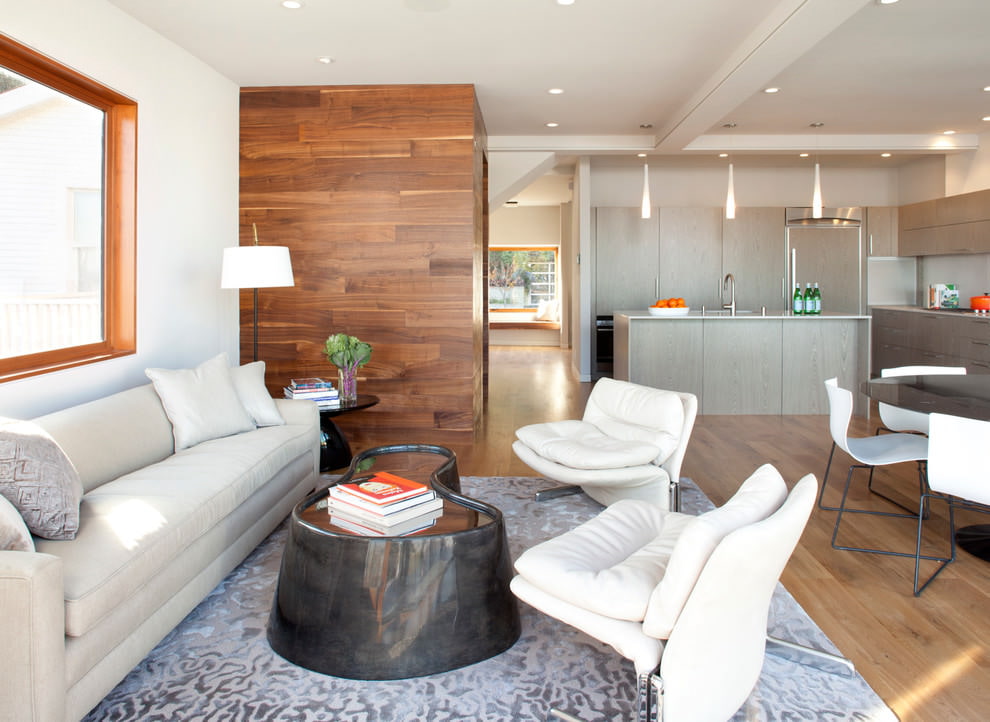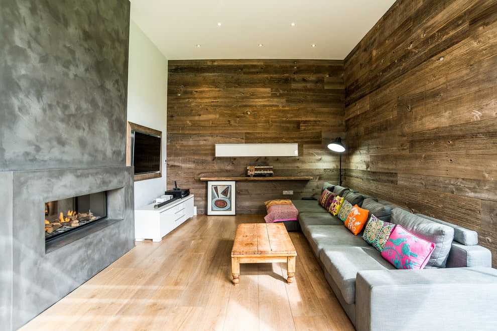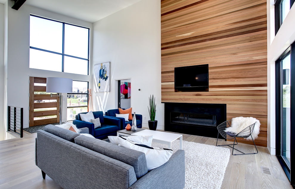 On the picture white color makes the interior of the living room lighter, and the texture of wood on the wall adds coziness.