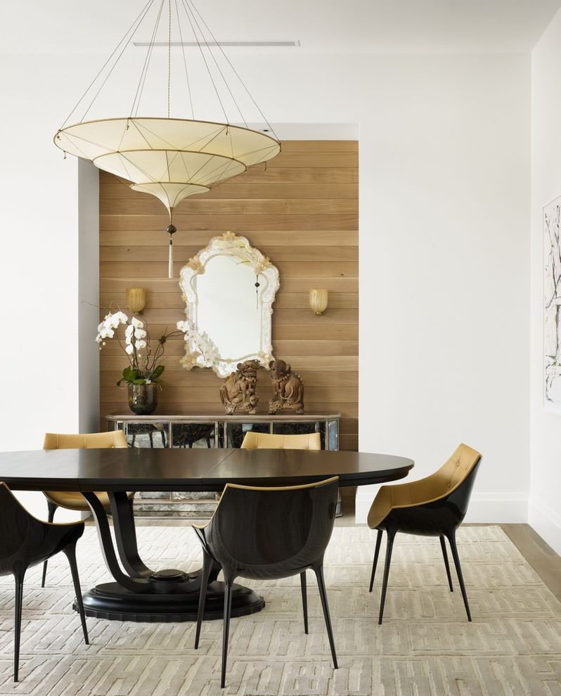 On the picture features an accent wall made of horizontal panels with mirrored inserts that create a sense of depth in the room that continues behind the laminate flooring.