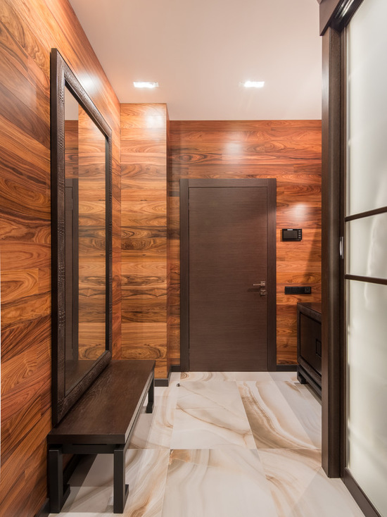 Wall laminate in the interior of the hallway should contrast with the color of the floor and it is better to sheathe only the lower part of the wall. It is recommended to mount the laminate on the wall in the corridor vertically, as this will not make it visually smaller.