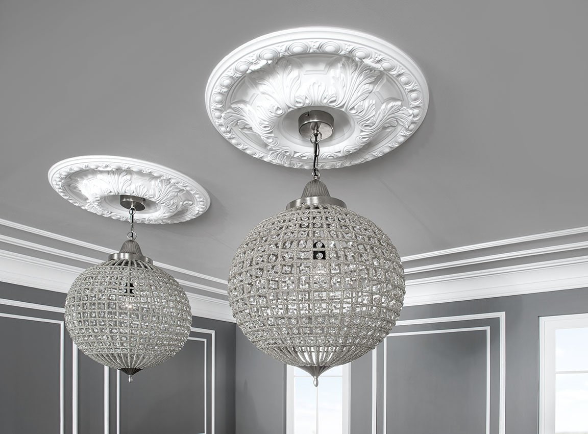 In the photo there are round stucco rosettes with ornaments combined with chandeliers.